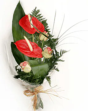 Pequeño arreglo floral con anturios , rosas rojas y claras , decorada con hojas frescas!