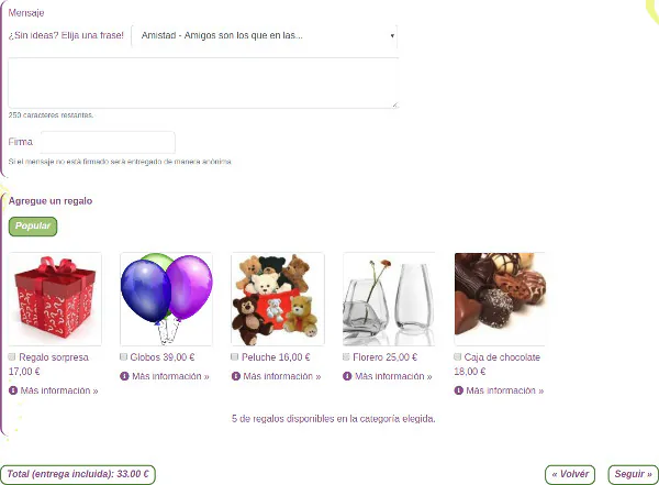 En el PASO 2 podrá escribir una dedicatoria para enviarla con las flores. Podrá elegir entre las frases existentes o escribir un texto personal.